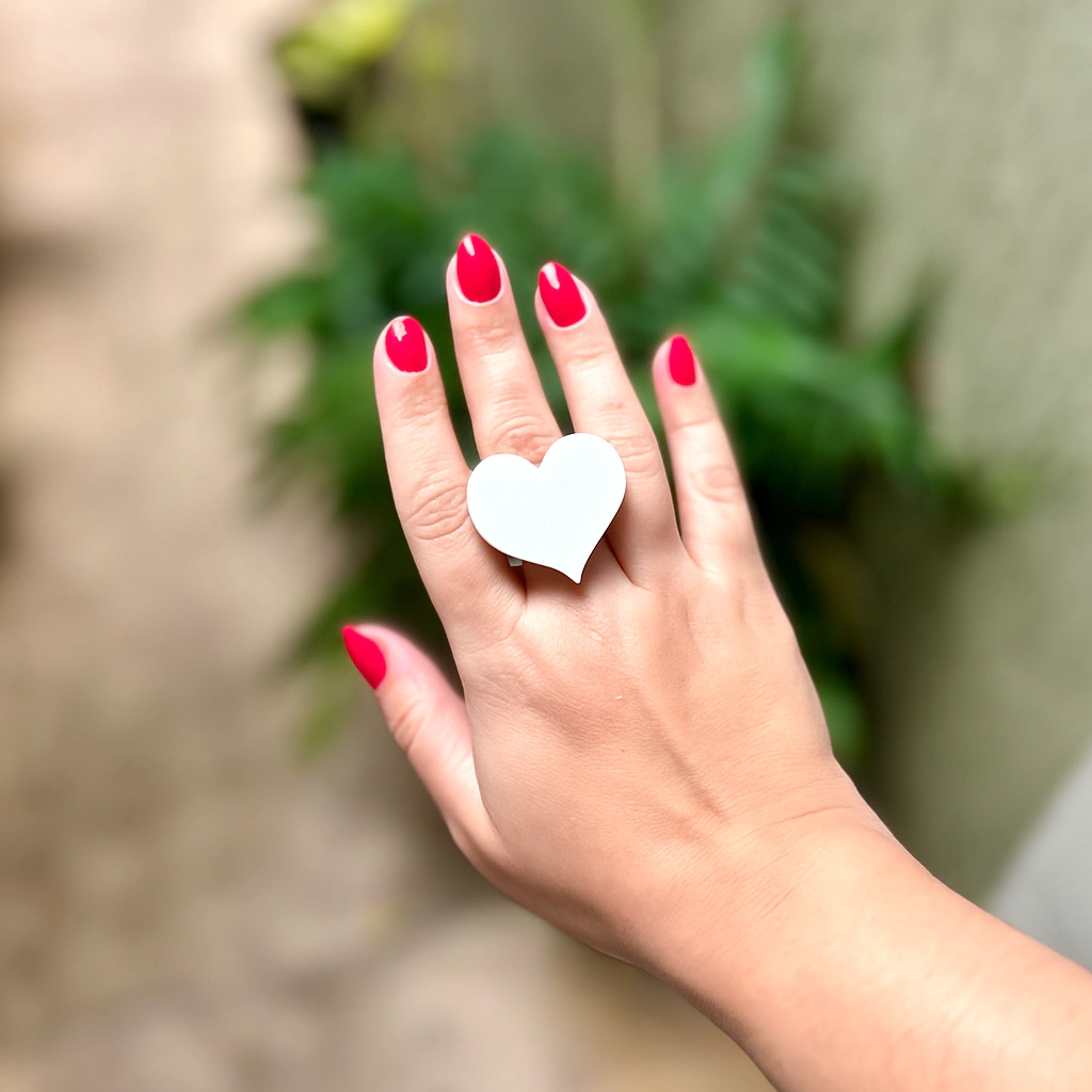 O Anel Coração combina um design romântico com a criatividade única da impressão 3D. Produzido com polímero plástico biodegradável, é leve, lavável e sustentável. Ideal para quem busca um acessório delicado e consciente.